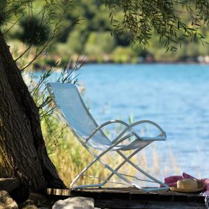 Rocking sunchair in metal structure galvanized in thermosetting powders for outdoor durability. Suitable for all weather conditions.